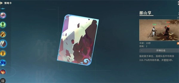 1、游戏里的策略多种多样,这里挑几个实用的来讲讲,其中有些是必须携带的。控制类方面,推荐摧山掌、万钧重锤。防御类推荐大藏心经、天罡真气、铁甲阵法、如归剑魂、金刚不坏、不动如山。输出类推荐藏锋积锐、梧叶舞秋风。