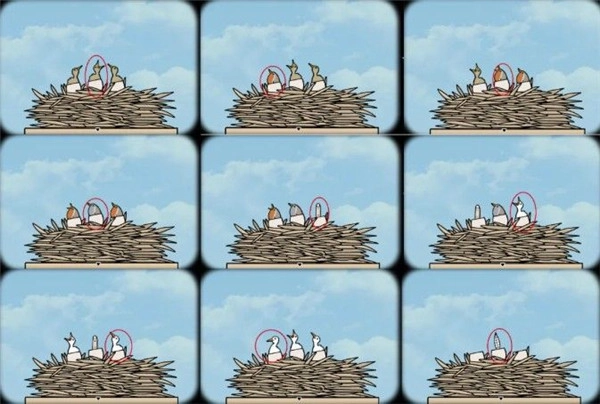 2、我们往右转,从机关上取回蛋。接着再往右转,看到鸟巢里面已经有两个蛋。把我们的蛋放上去,再依次敲开。蛋壳里孵出小鸟。