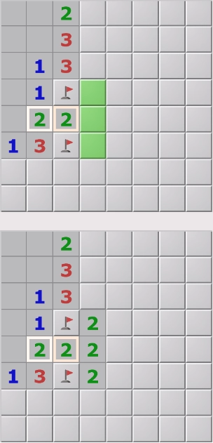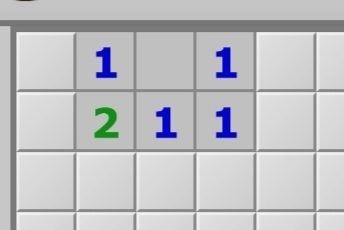 4、看下图,左边的2可以确定两个未打开的邻格是雷,右边的2共有五个没有打开的邻格,其中也包含这两个雷,因此可以确定剩余3个格子不是雷,可以点开。