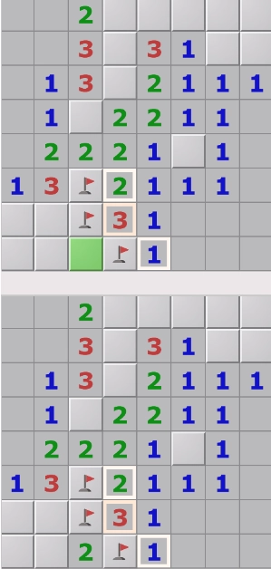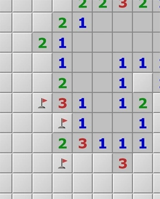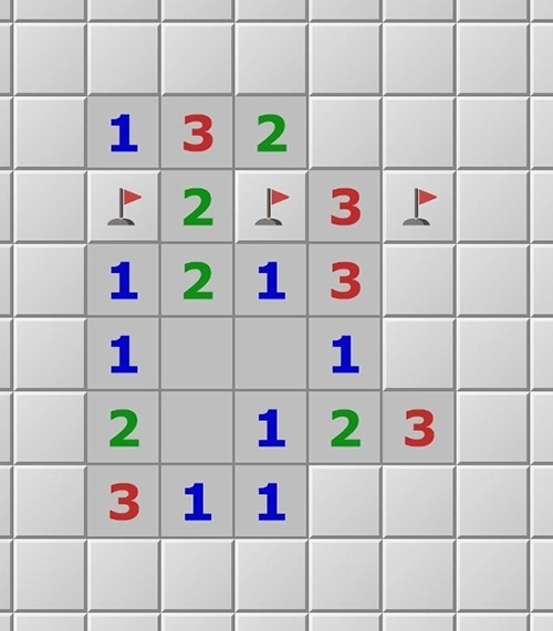 5、再看下图,数字3有四个邻格没有打开,这些格子中,通过上面的2可以确定两个雷,通过右下方的1可以确定1个雷,因此可以确定剩余的一个格子不是雷,可以点开。