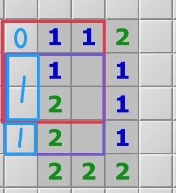 如上图所示,根据扫雷规则,可以很轻松的推出左侧雷的分布,可以这么理解,因为红色框的中间是1,所以红色框里左边三个格子只会有一个雷,同理,紫色框的左边会有两颗雷,而且分布在两个蓝色的框里。