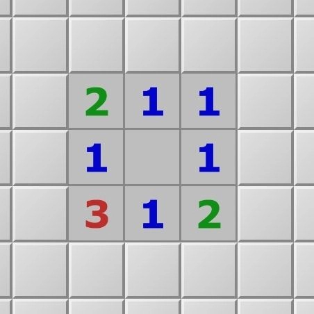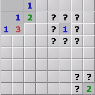 如图所示,一个格子周围最多有八个相邻的格子,数字表示相邻的格子当中共有多少个雷,空白的格子表示0。