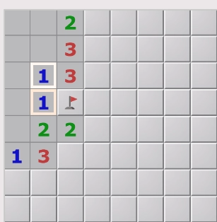 边上的(右上角)1说明周围只有一个雷,下方的1说明新增的三个格子里并没有雷,可以放心的点。