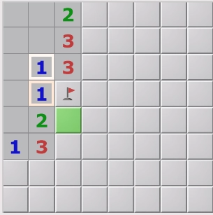 3、再看第二个数字1,它有两个邻格没有打开,而其中一个已经确定是雷,因此可以确定另一个是安全的,可以点开。