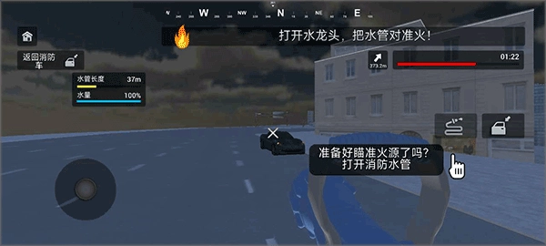 2、进入游戏后,右边的箭头用于控制前进和后退,同时也控制车的方向。右边上方的图标,分别为车辆报警器以及切换消防水管的标识。