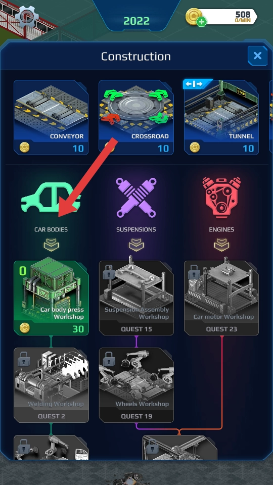 4、选择箭头指向的CAR BODIES车身相关选项,可开展车身相关的建设与生产工作,推进汽车生产流程。
