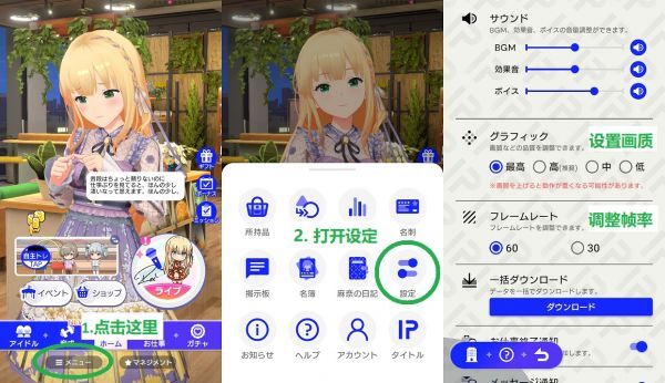 在底部菜单中,能够对“育成”、“首页”、“工作”这3处的偶像进行更换(可选择设置为固定偶像搭配固定衣装,或固定偶像搭配随机衣装,亦或是随机偶像搭配随机衣装),具体步骤如下: