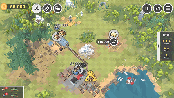 综合经营管理类玩法,提供50张地图供玩家体验。每张地图都宛如一个小型经济系统,其中设有各类资源采集点,涵盖木材、石头、钢铁、粮食等多种基础材料。玩家需借助火车,将这些资源运送至各个加工厂,并在规定时间内达成关卡生产目标。系统会依据时间等相关因素给出星级评价,最高为5星。