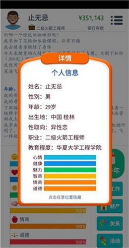 1、一款轻度模拟人生的休闲游戏,从婴儿到死亡的全部过程,你的选择将决定你的未来;