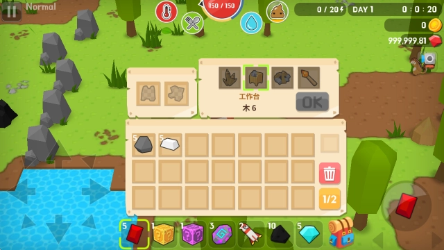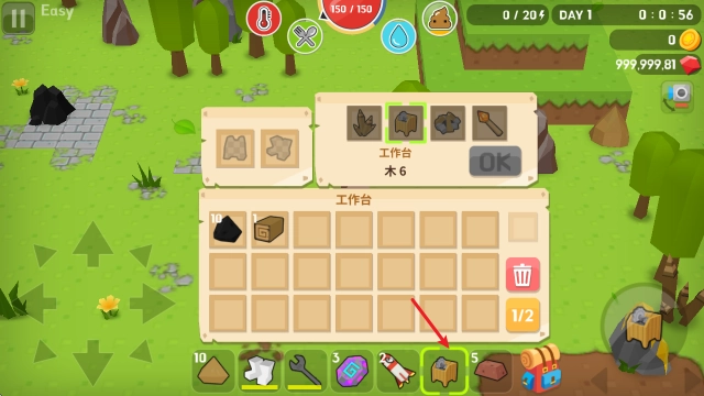 3、采集资源后,我们可打开背包制造一些实用工具,而这首先要建造工作台。