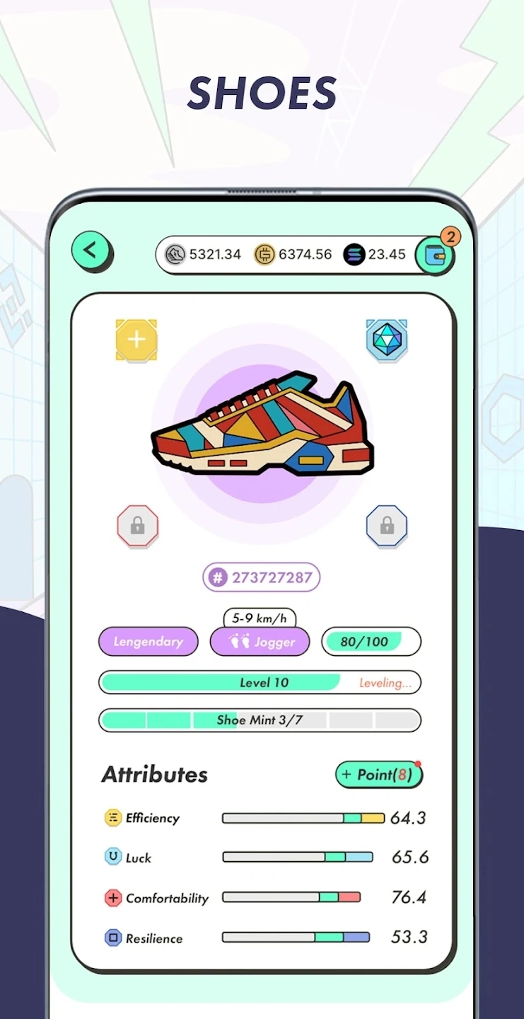 1、NFT运动鞋分为“走路鞋,慢跑鞋,快跑鞋和全能鞋”四种,使用不同的鞋子需要玩家在运动中匹配对应的速度才可以达到最大化收益。