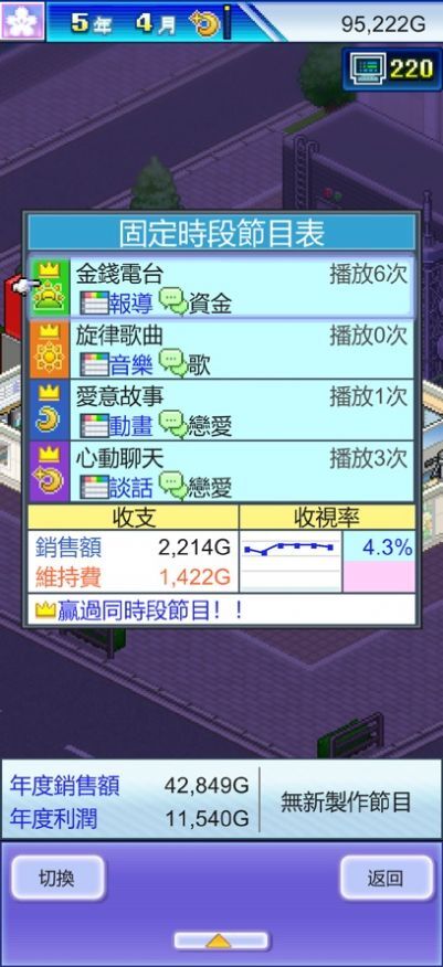 9. 收视率上限与“节目单”的神秘电视台四人组相关,战胜他们会出现王冠图标,若将四人全部击败,就能前往“投资”并选择第一个投资选项。节目播出时间久了,收视率会降低,要记得更换(收支平衡时不会有系统提示)。