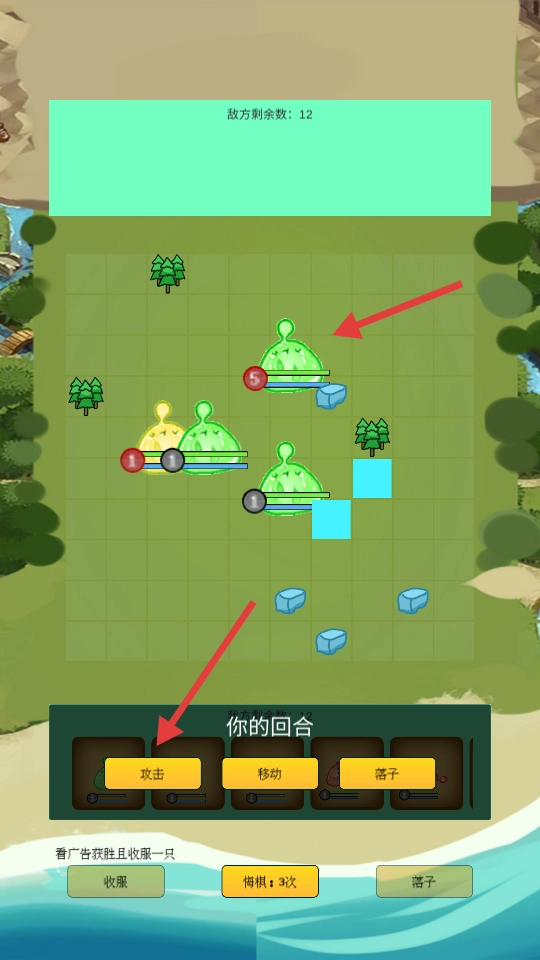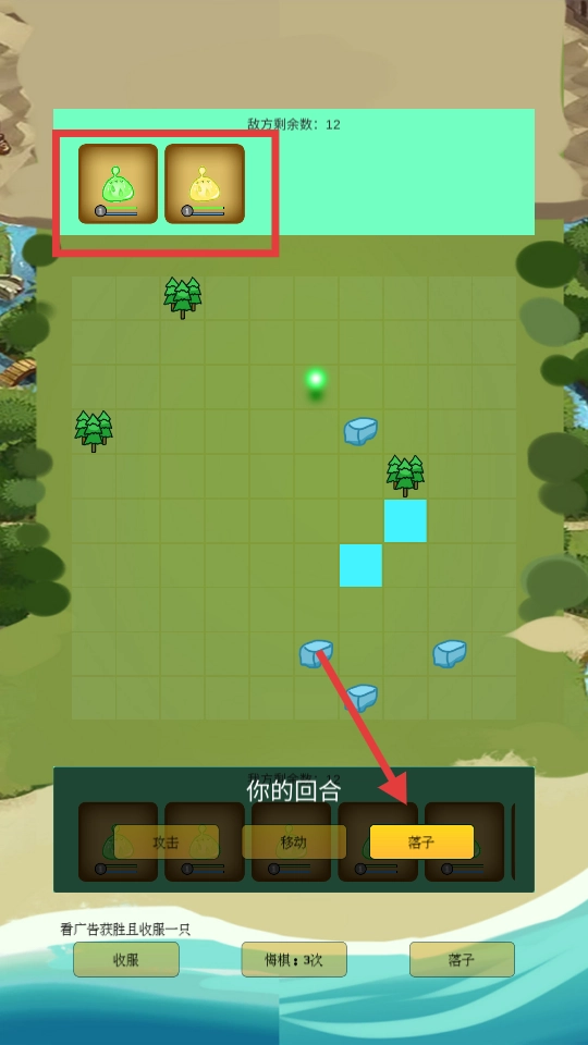 3、战斗时,点“落子”,布置史莱姆到棋盘。