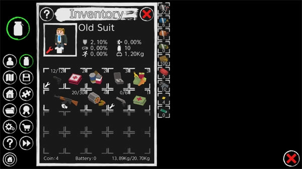 6、点击左上角瓶子按钮可以打开背包,背包里有你收集的各种资源和武器,点击就可以使用。