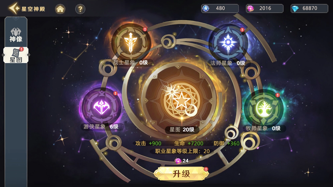 玩家首次获得初始稀有英雄,或将初始稀有英雄首次升阶至更高品阶时可获得星辰,星辰可提升星图等级。星图等级可以给全队英雄提供额外的攻击力、生命值和防御力加成。