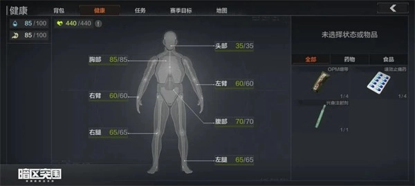 3、在暗区突围中,药品和身体构造分别有哪些?