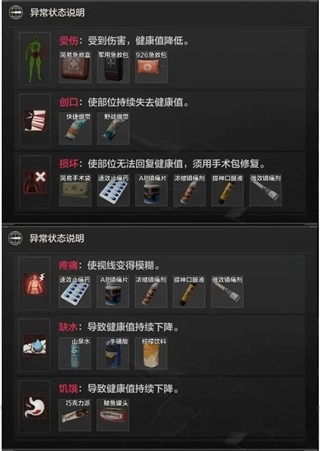 除此之外,还有恢复水量的各种饮料、恢复能量的各种食品、以及暂时免疫损坏负面状态的镇痛剂、止疼药等等,暗区先锋们也可以参考下图,查看部分常用药品和药品功能。