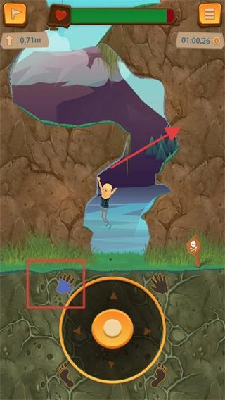 2、把脚部固定好之后,切换轮盘来触发“手”的图标,接着操控角色伸出手去抓住上方的岩石支点,然后一步步向上移动。