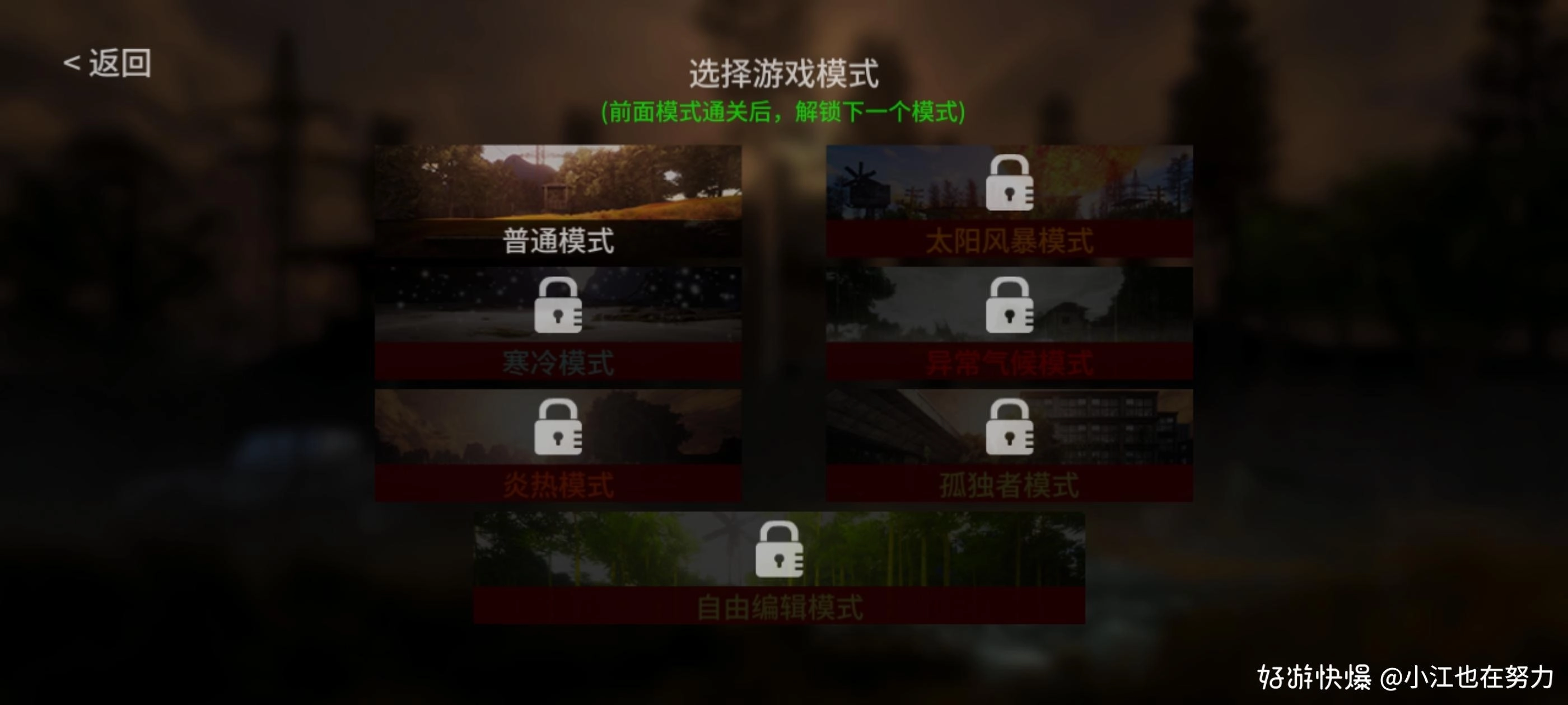 游戏模式有:普通、太阳风暴、寒冷、异常气候、炎热、独孤者、自由编辑