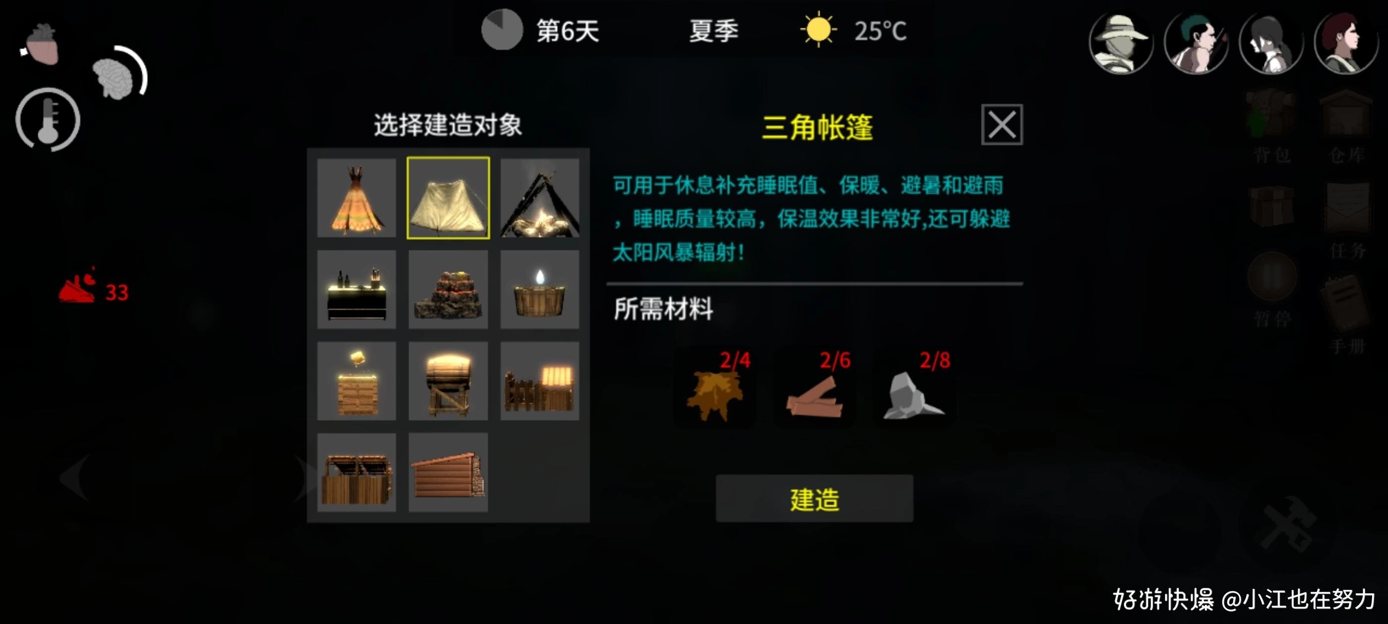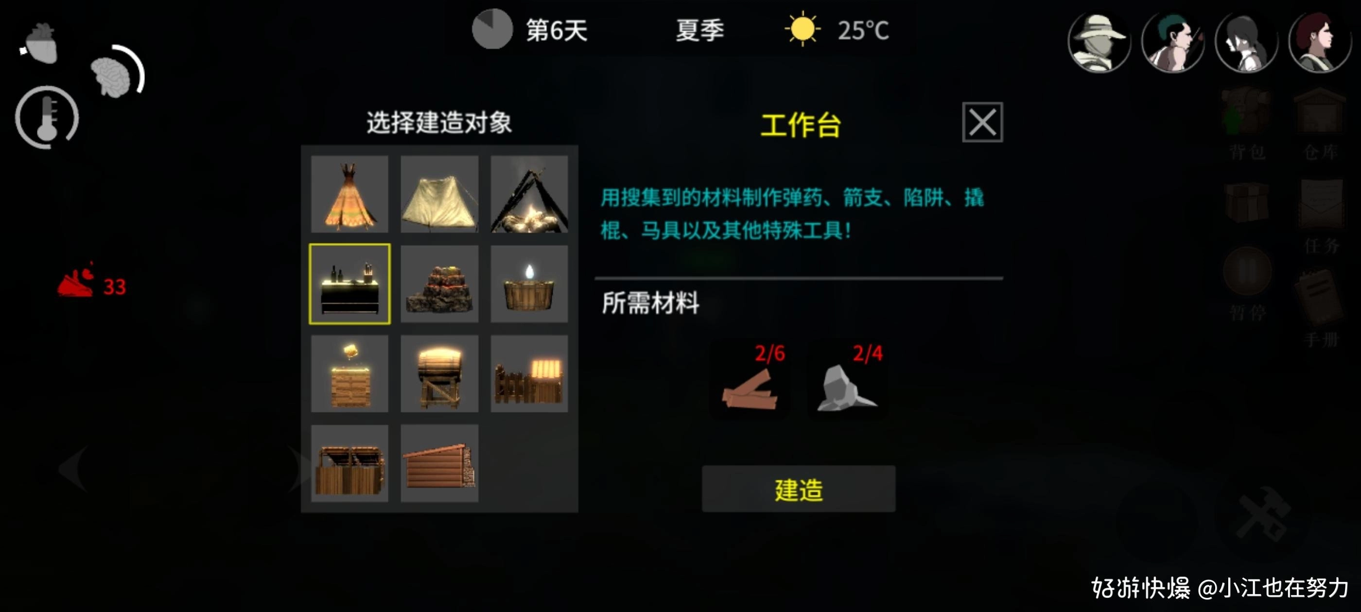 在我看来需要优先制造帐篷,火堆,工作台。