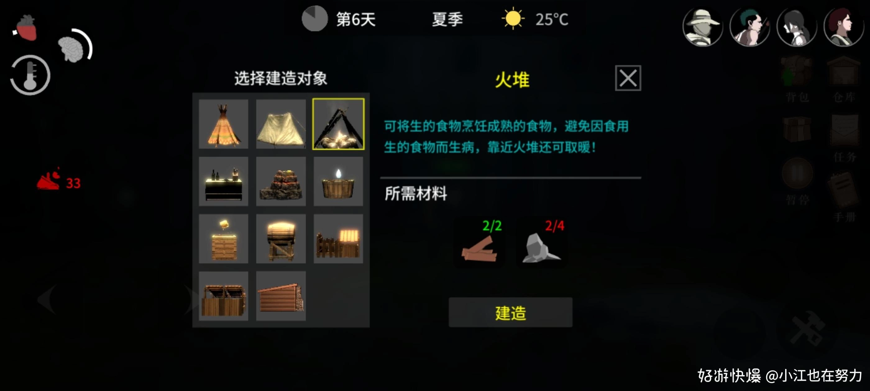 想要健康的身体活着比其他先遣者久,我们就要需要吃熟食,那么熟食肯定少不了火堆。