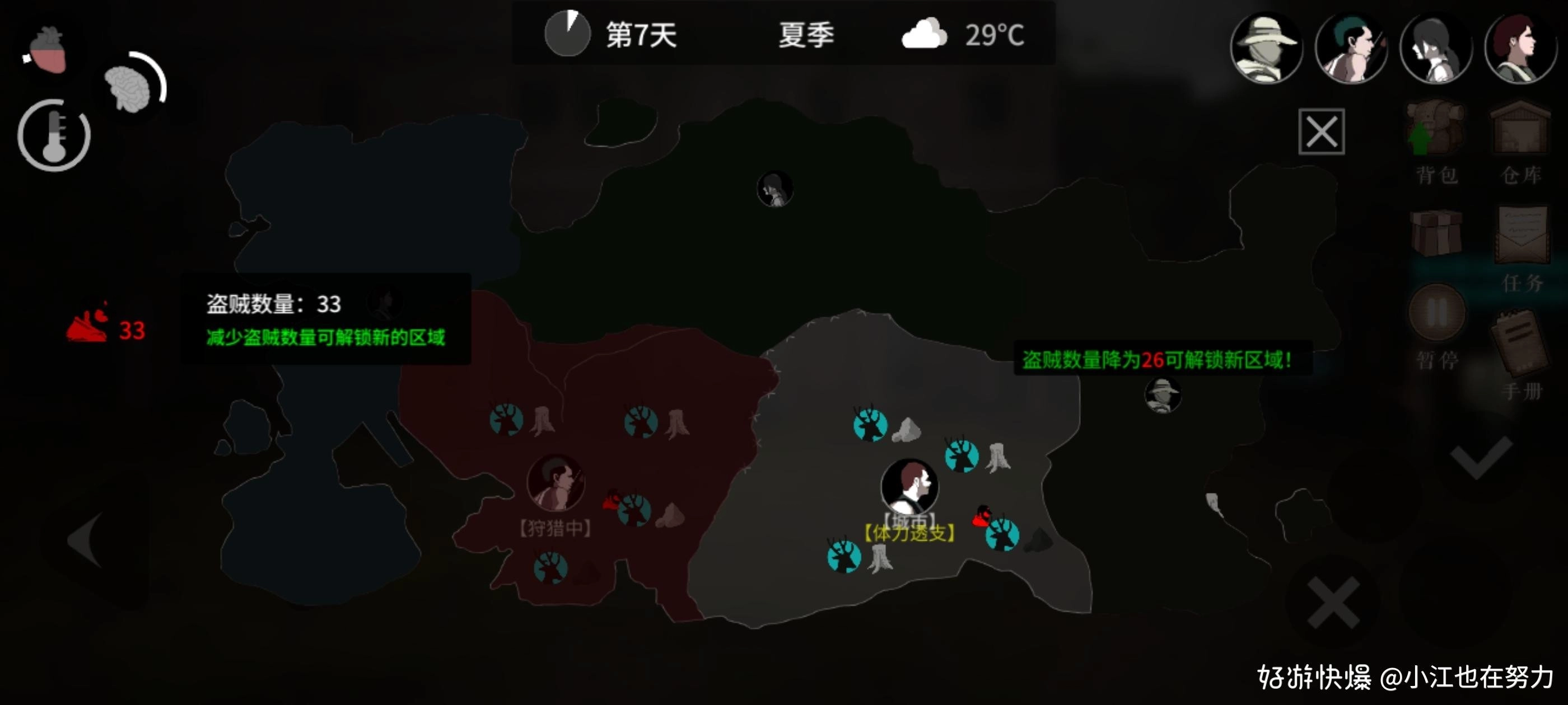 我们需要注意的是地图左边红色人头显示的是当前盗贼,当盗匪少于一定数量就可以解锁新区域。同时我们所属区域内盗贼标志,表示这个地方有盗贼,我们需要前往这个地方将盗贼赶出去。