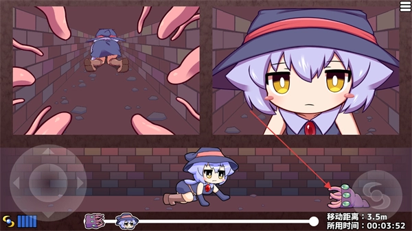 2、进入游戏关卡后,通过左侧移动摇杆操控角色移动,躲避场景内的怪物,推进移动距离以达成关卡进度。