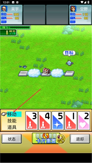 3、在探险战斗界面,先点击下方的移动选项,再配合卡片进行操作,向目标区域推进以推进探险进度。