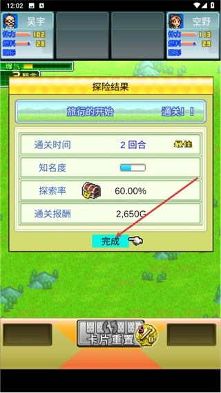 4、在探险结果界面查看通关信息后,点击界面中的完成按钮,结束本次探险并获取对应的通关奖励。