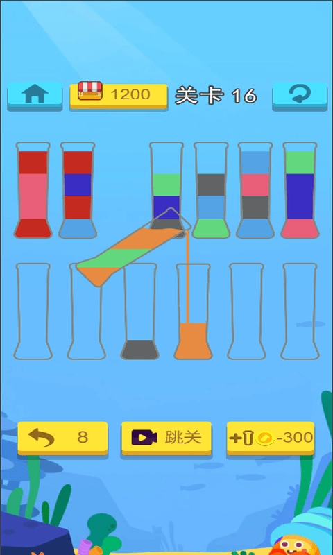 这是一款有趣的拼图游戏,玩家需要在游戏中把相同颜色的水倒入同一个试管里。