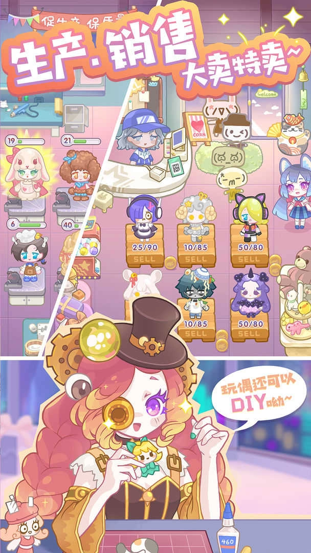 经营店铺,出售潮玩,捕捉商机!在游戏中,告别枯燥传统的抽卡系统,你可以经营属于自己的盲盒店铺,精致的盲盒机,抽取图纸,生产经营,上架销售,招募托管住手,建造属于自己的梦幻乐园。