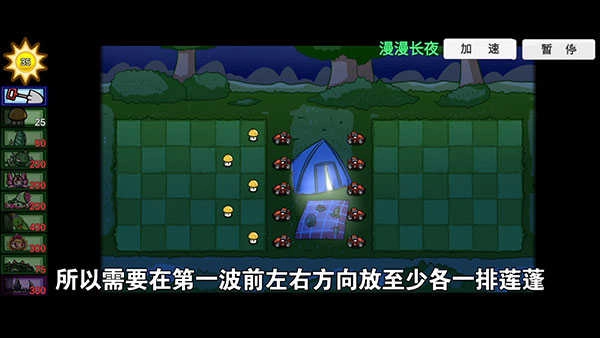 3、然后我们需要在第一波前左右方向放至少各一排莲蓬。