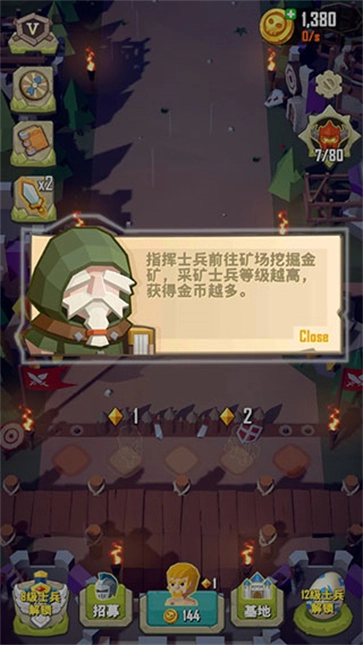 3、派遣士兵前往矿区开采金矿,士兵等级越高,产金币也越多。