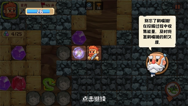 3、在挖掘的过程中可以收集能量,千万不要等到你的鹤嘴锄损耗坏掉,这时就不能再移动了。