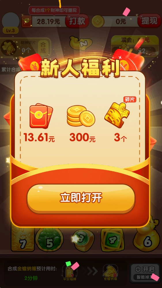 3、新手进入后可以轻松合成出两个财神,随后就会领到新人奖励。