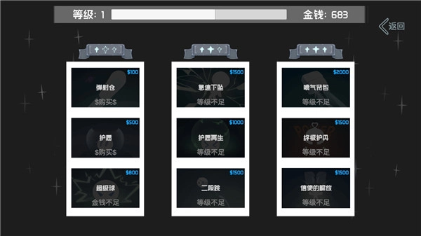6、钱有什么用呢?可以买天赋,就比如二段跳,喷气背包等等天赋。当然最有用的无非是二段跳,快速落地(跳起来按翻滚可以快速落地),护盾(开局就有护盾),魔法球(可以一边翻滚一边跳跃,非常好用,刚开始玩的话必须买)。但是,天赋也是有限制分等级的,有1-3级,等级越高天赋越强,越贵。