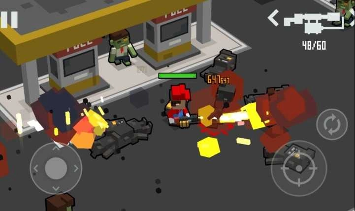 1、使用左侧虚拟摇杆控制角色移动,右侧按键进行武器攻击,消灭沿途所有僵尸。