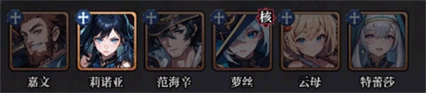 嘉文和云母可提供护盾,双方联动强化生存能力,范海辛具有超强生存能力且能降低敌方受疗效果和效果抵抗,全体英雄可提供【封印】效果限制敌方英雄行动并增强萝丝的输出,莉诺亚补充伤害,特蕾莎为队伍提供恢复。