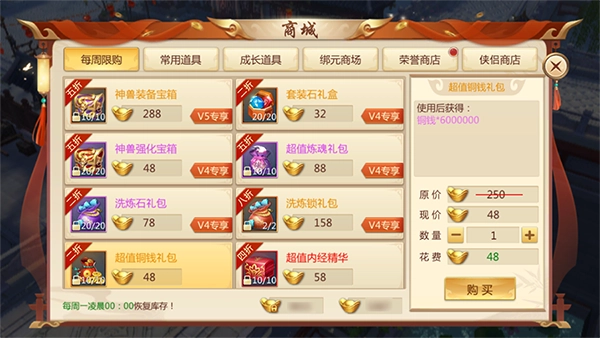 每周可以在商城花费少量元宝购买“超值铜钱礼包”换取巨额铜钱。