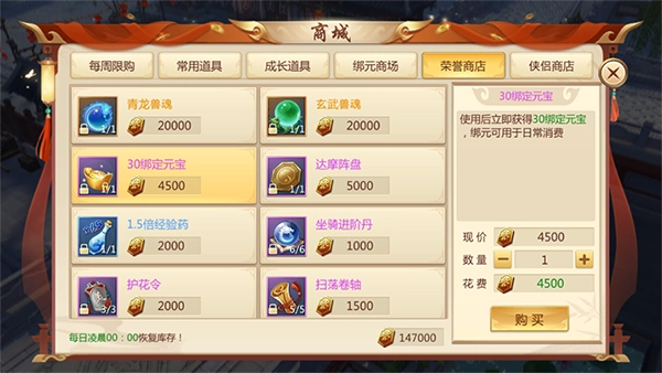 荣誉商店每天可以购买30绑元,少侠要记得及时购买哦~