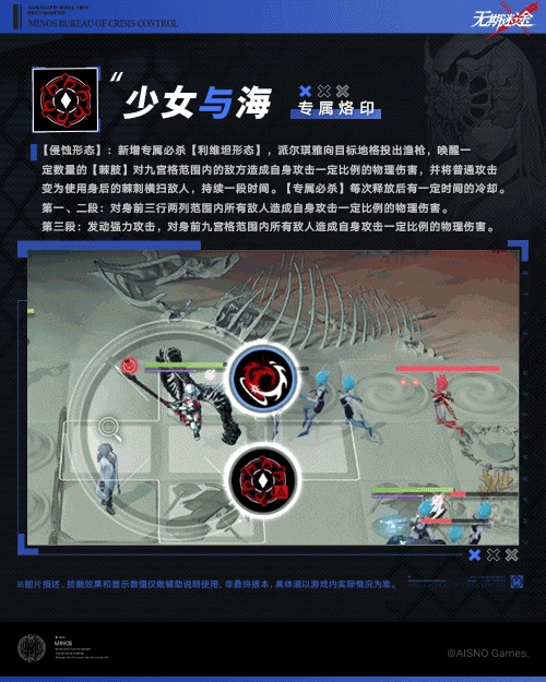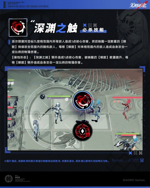 【侵蚀形态】:新增专属必杀【利维坦形态】,派尔琪雅向目标地格投出渔枪,唤醒一定数量的【棘肢】对九宫格范围内的敌方造成自身攻击一定比例的物理伤害,并将普通攻击变为使用身后的棘刺横扫敌人,持续一段时间。