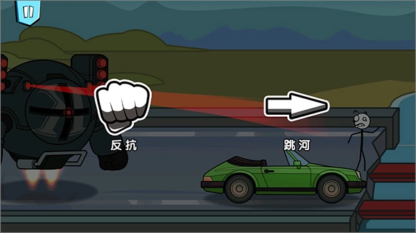 1、玩家启动火柴人历险记游戏,点击开始按钮后,游戏内的火柴人会被一个机器人追至断桥旁,此时玩家能够选择反抗机器人或是跳河逃生,不同的选择将导向不同的游戏结局;