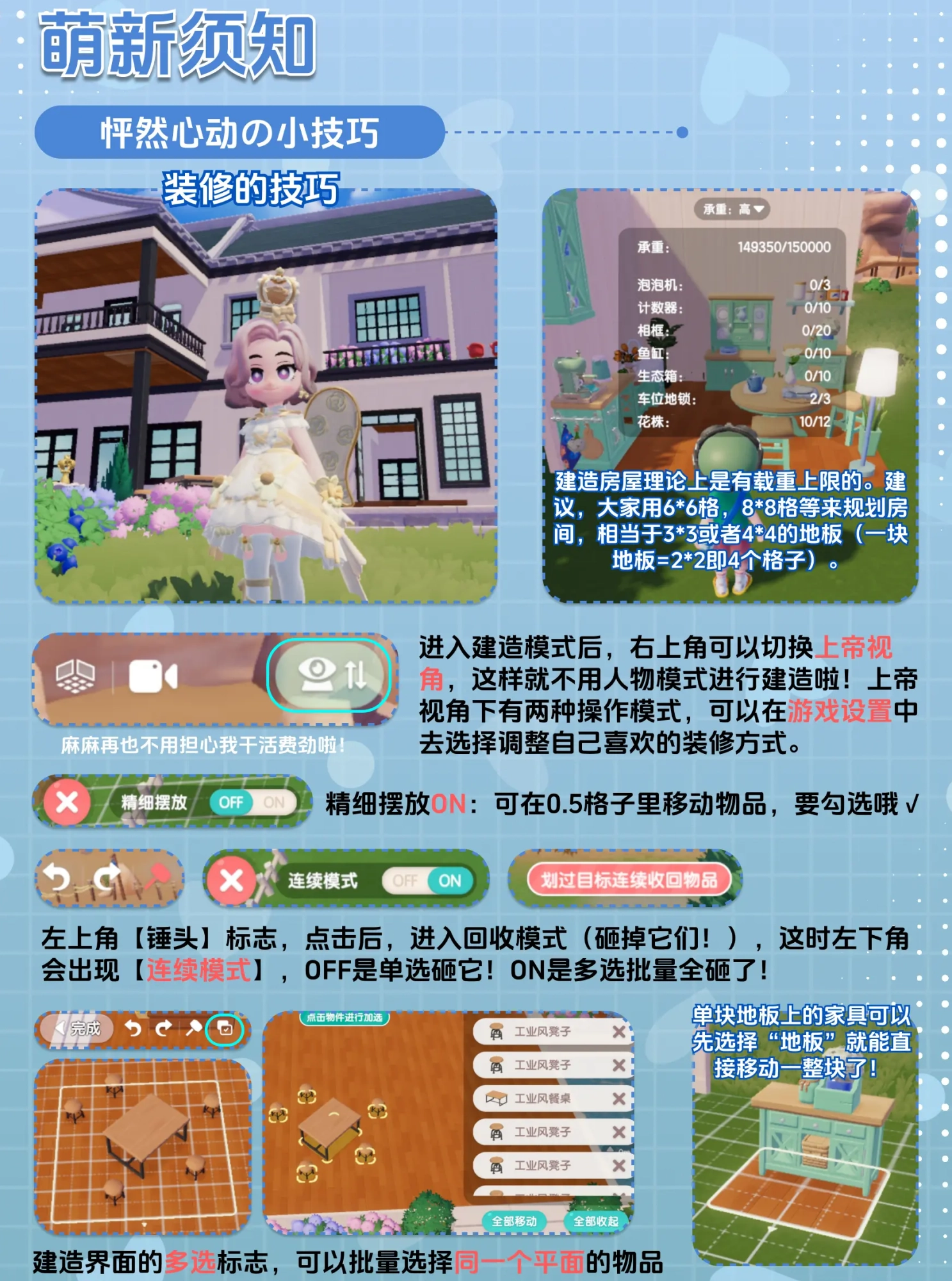 3、装修技巧篇:为大家总结了一些实操时才发现的小技巧,有些建造的功能用过才知道!另外,在我自己造完超大房子、给房屋负载变“高”之后,发现了一件事!!——虽然我们总追求大房子,但是真的盖得很大的时候,实际上因为屋顶、超大家具的载重,会让房间的其他空间没法放更多的家具,整体空间反而不好看。因此建议,大家用6*6格,8*8格等来规划房间,相当于3*3或者4*4的地板(一块地板=2*2即4个格子),小而美有时候也挺好的。嗯!