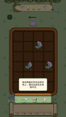 2、将底下的花瓣拖动到游戏格子内,相同颜色的花瓣会自动合成成一朵花,成功消除坏花。