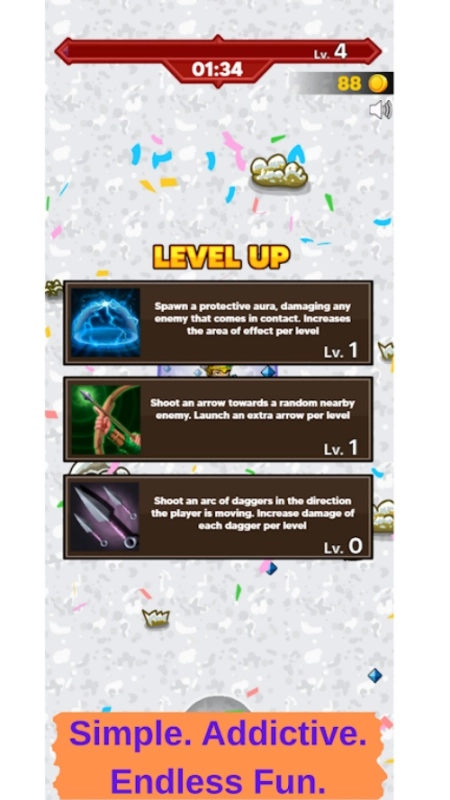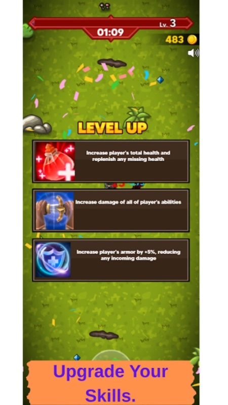深度角色养成:每次升级可提升健康、伤害、护甲等多种属性,升级选项无限且与生存时间挂钩,让玩家能不断强化角色,应对越来越强大的敌人。