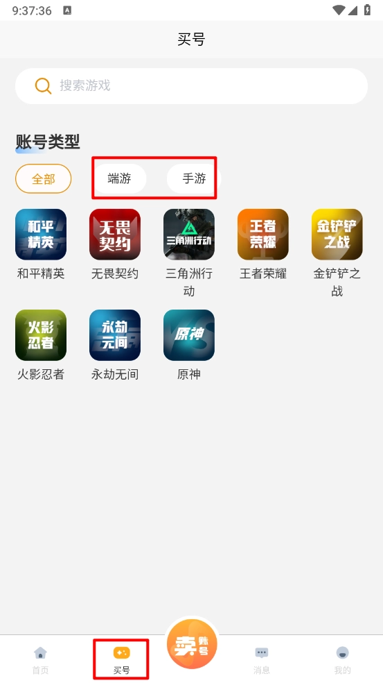 3、还可以切换至"买号"板块选择端游或进行交易。