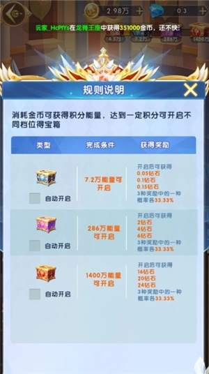 3、挂机一会,积累足够的积分能量,就可以开启宝箱获得钻石。