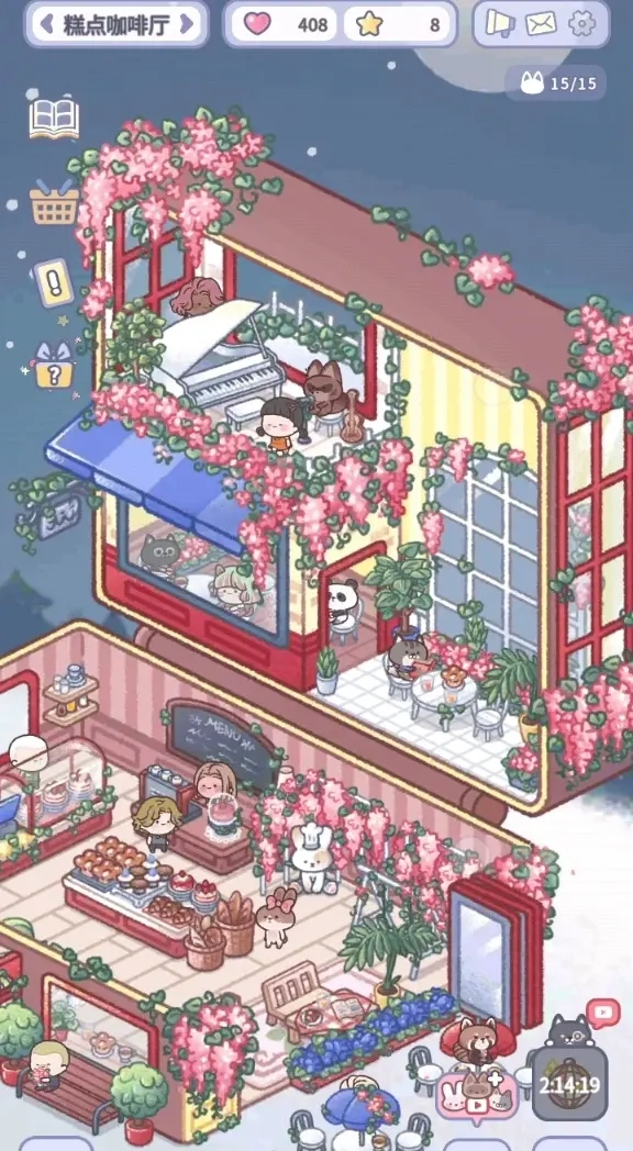 这是一款相当佛系的放置类游戏,在线时能做的操作主要就是添加物件,资源方面的限制比较严格,只有等朋友来访并离开后才能获得心。从流程来看,它更偏向模拟经营,但整体节奏十分缓慢,在线状态下没太多可操作的内容,稍微摆弄几下就能下线等待资源积累了。养成玩法其实就是模拟经营里常见的替换式升级,每一种摆件都对应着一种或多种特定客人,这部分存在一定的探索空间,也算是一种关于顾客的成就系统。游戏的美术品质值得称赞,箱庭式的结构设计让场景看起来颇具观赏感和趣味性,细节处理也比较到位,配色风格柔和舒适,给人的第一印象相当不错。不过角色的动态效果不算特别丰富,在线游玩时实际上没有太多值得长时间观赏的内容。
