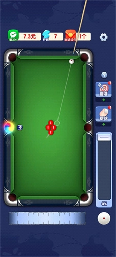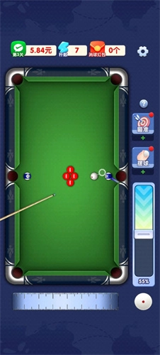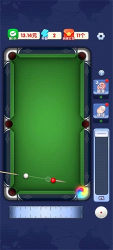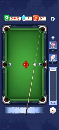 1、首先玩家得调整球杆的位置,此时会出现一条虚线,这条线会显示出台球行进的路线,还能看出被击打的台球能否准确入袋。