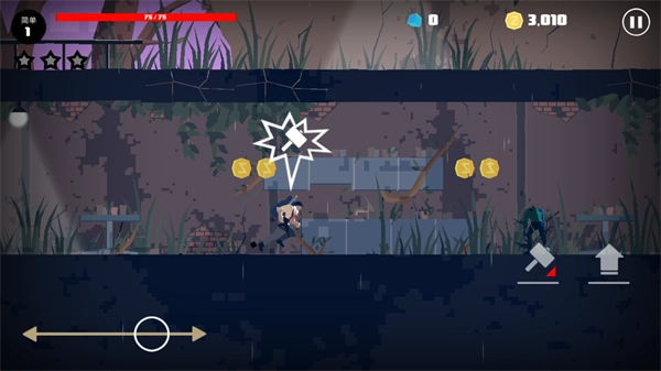 2、左侧可以控制角色的左右移动,右侧则是攻击和跳跃按钮。